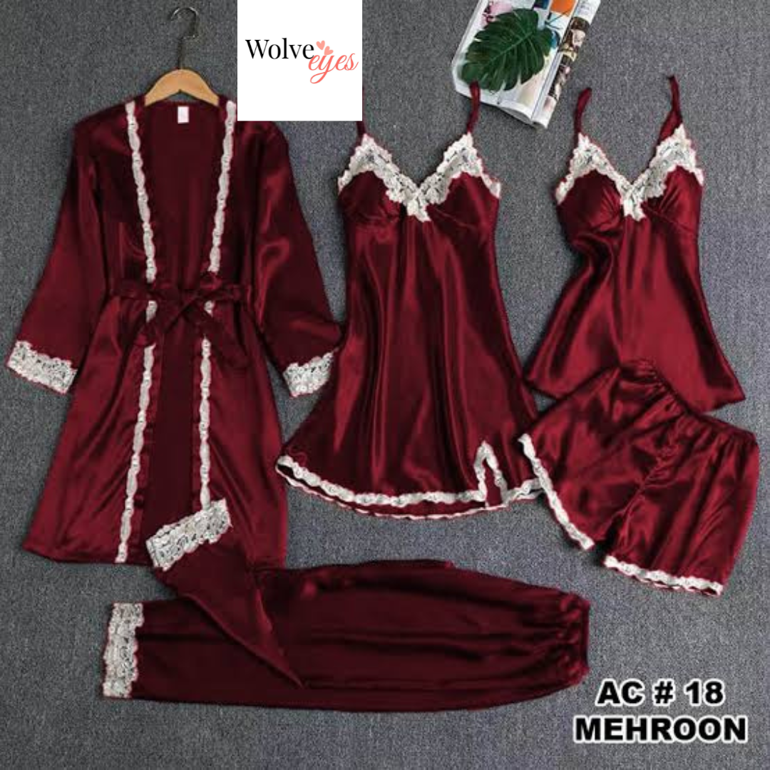 Yeh 5-piece nightwear set ne toh dil jeet liya mera! Har piece – robe, dress, shorts, top, aur pants – sab kuch bohot hi soft aur stylish hai. Lace detailing elegant lagti hai aur satin ka feel bohot rich hai.