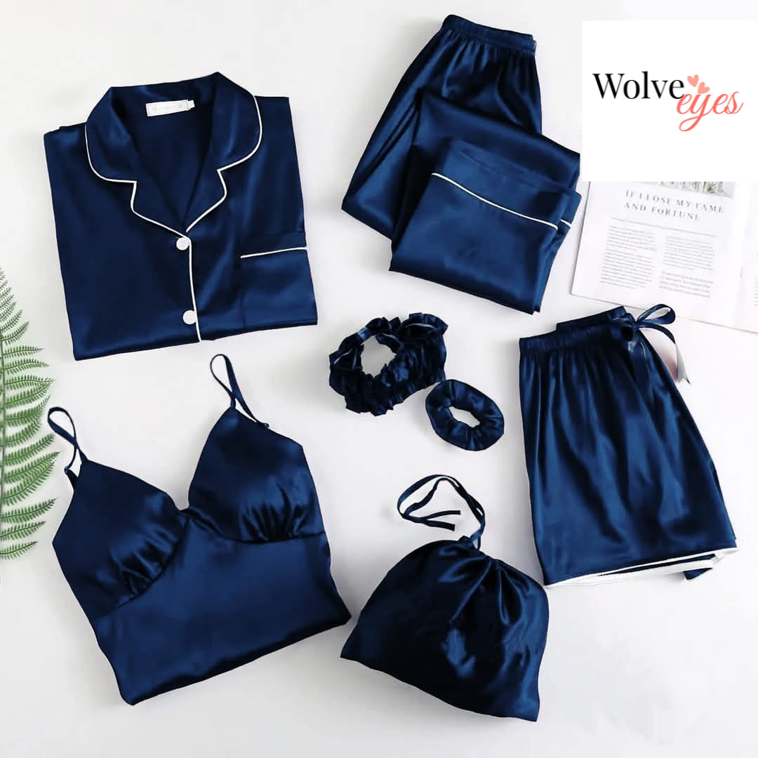 Indulge in timeless elegance with our Black Silk Nightwear Set, designed for women who love comfort without compromising on style. Crafted from soft, breathable satin silk, this 7-piece set includes: